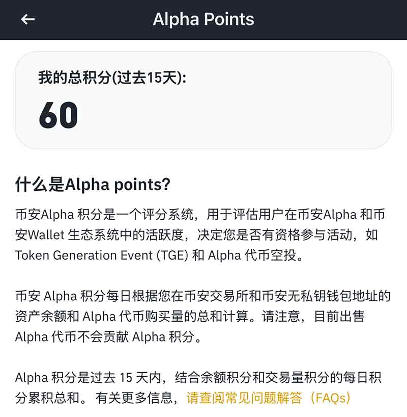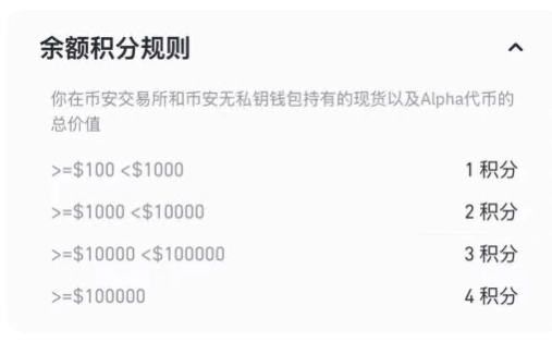 币安会根据你在交易所和指定地址的资产余额,以及 Alpha 代币的购买量,每日计算你的 Alpha 积分。