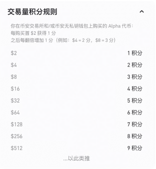 交易量积分根据你每日购买 Alpha 代币的交易额(以价值衡量)计算: