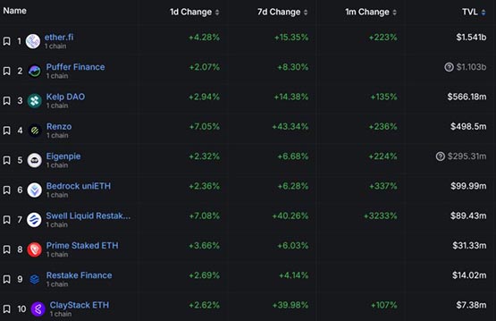 流动性再质押项目前十名,包括 Ether.fi、Puffer Finance、Kelp DAO、Swell 等,最近的资金流入量都在增加。而且这还是在 EigenLayer 关闭了流动性质押代币 (LST) 存入通道的时候发生的(现在只能存入 ETH),可见市场对 LRT 领域和相关活动有多么狂热。