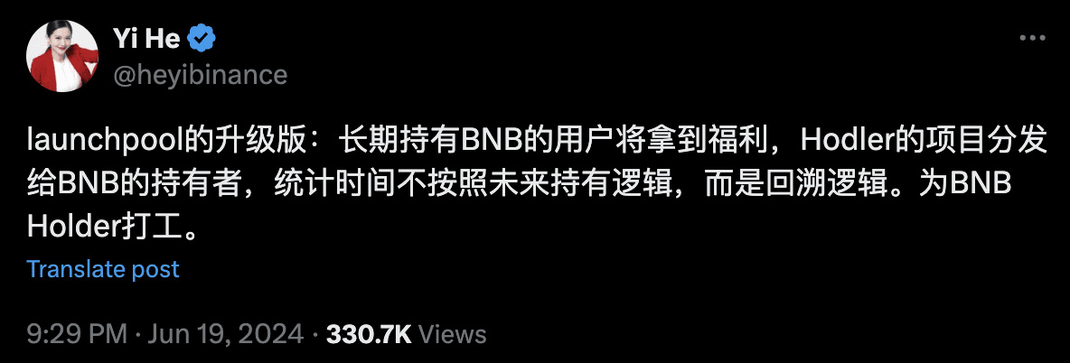 因此,如果你在 HODLer 空投活动公告后才购买 BNB 保本赚币,那么只能参加下一期的活动了。币安共同创办人何一将 HODLer 空投称为 Launchpool 的升级版,是为 BNB Holder “打工”。