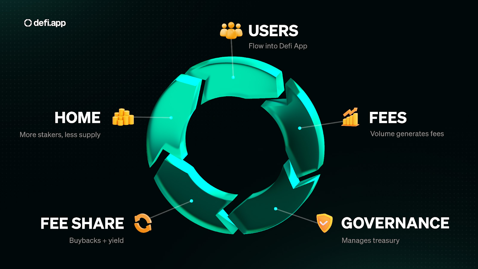 Defi App (HOME) 价值飞轮:用户进入应用 → 产生协议手续费 → 治理机制决定费用分配 → 分润给质押者 → 增加质押诱因 → 吸引更多用户参与,形成正向循环。