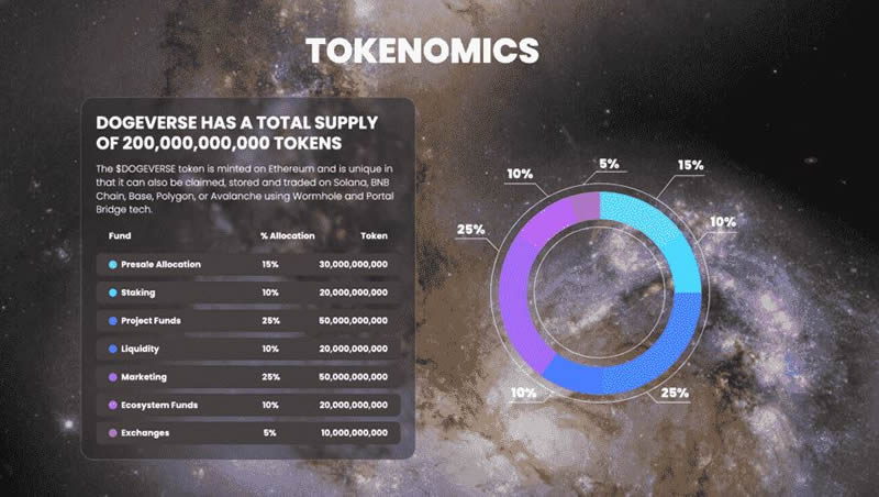 Dogeverse的代币经济学设计旨在为项目发展提供资金,奖励早期参与者,并确保生态系统的长期稳定。