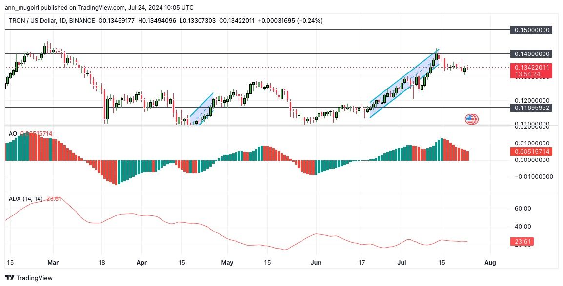 另一方面,如果市场情绪不好,Tron币的价格可能会稳定在0.13美元左右。进一步下跌可能会使其价格降至0.12美元左右。如果压力加大,Tron币可能会在0.1美元处获得支撑。