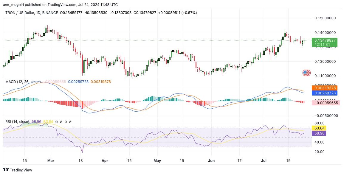 Tron币的价格正在经历显著上涨,表明存在潜在的上升趋势。如果这种增长持续下去,Tron币的价格可能很快超过0.15美元。如果势头持续,可能会接近0.2美元,甚至更高。