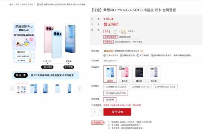 目前,荣耀 500 系列已在官方商城上架预约,拥有海蓝宝、星光风、曜石黑和月光银四种配色,容量版本有:12GB+256GB、12GB+512GB、16GB+512GB 和 16GB+1TB。