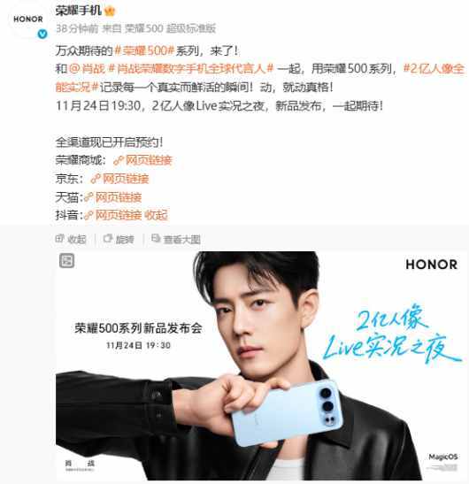 【太平洋科技快讯】11 月 17 日消息,荣耀 500 系列新品发布会定档 11 月 24 日 19:30 举行,肖战为荣耀数字全球代言人。