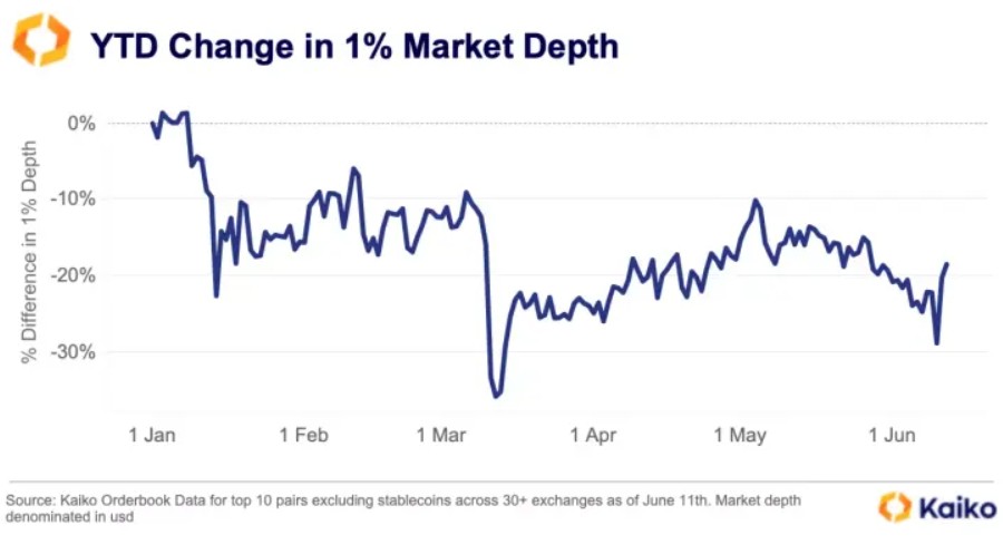 加密货币市场的“市场深度”今年一直处于低位。市场深度指的是市场吸收大额买卖单的能力。当市场深度不足时,大玩家的买卖行为很容易引起价格的剧烈波动。