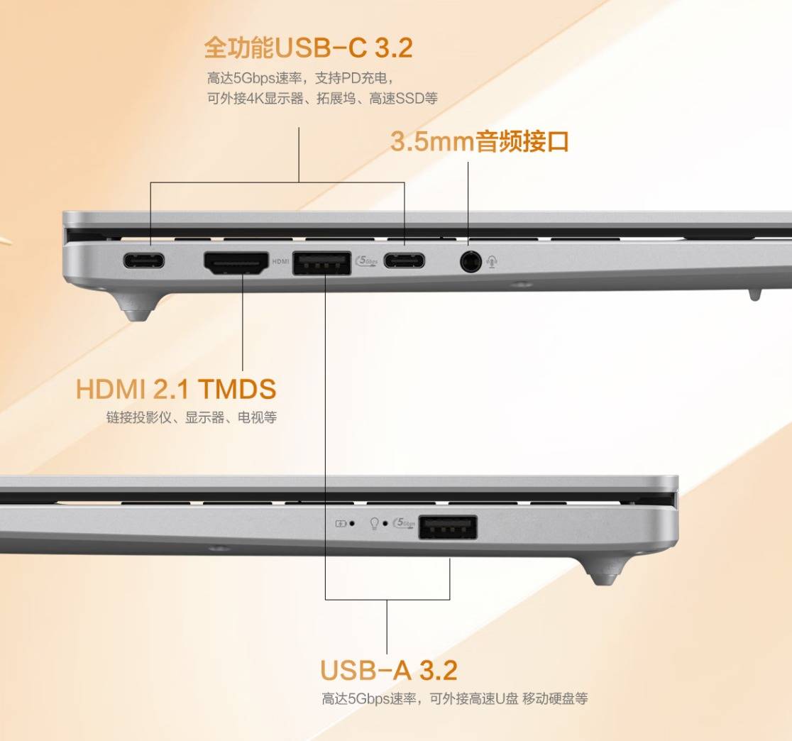 2个全功能USB-C 3.2接口速率高达5Gbps,不仅支持PD快充,还能外接4K显示器、高速移动固态硬盘、拓展坞等设备。办公室连接双屏办公时,一根线就能搞定视频输出和充电,桌面整洁程度提升几个档次。
