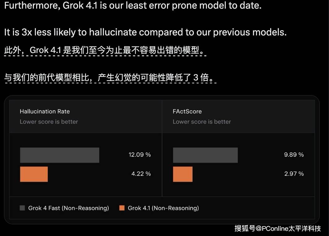 Grok 4.1 的最大亮点在于它对大模型顽疾的针对性优化。xAI 团队这次把后训练阶段的重心放在了减少幻觉上,通过大规模强化学习和针对信息求取类提示的专项纠偏,新模型在真实世界查询中的幻觉率从 Grok 4 的 12% 左右直接降到 4% 左右,降幅接近三倍。这意味着用户问事实性问题时,Grok 4.1 更不容易胡编乱造,而是给出可靠、可验证的答案。对于依赖 AI 进行研究、写作或决策的用户来说,这无疑是一次实质性进步。