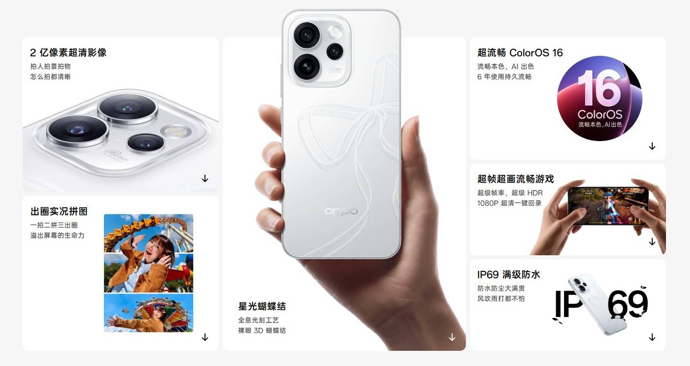 Reno15系列延续小直屏轻巧设计,并在细节上大幅提升质感。行业首发的全息光刻工艺,使“星光蝴蝶结”配色呈现出裸眼3D的立体纹理,在光线下宛如星河倾泻。机身采用高亮冰透玻璃、喷砂金属中框与冷雕镜组,多层纹理细腻精致,同时支持IP66/IP68/IP69满级防水,实现美感与耐用并存。