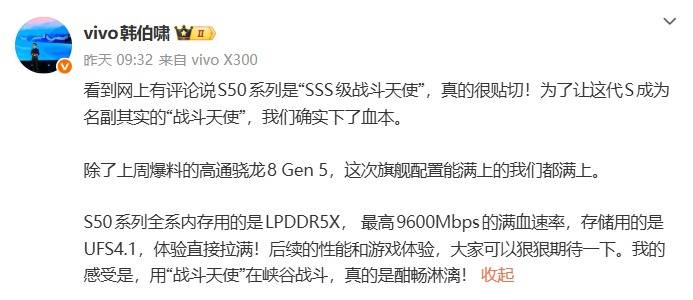 vivo产品经理韩伯啸此前曾表示,S50系列希望在芯片、影像和整体体验上全面对标旗舰,因此本代机型加入了“旗舰三大件”,包括骁龙8 Gen5、IMX882潜望长焦以及3D超声波指纹。从目前的消息来看,这一方向与爆料完全吻合。