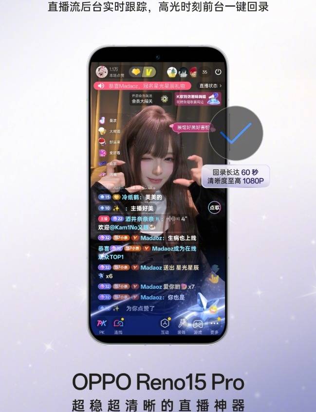 如果你对稳定开播、户外Vlog或直播创作有需求,Reno15 Pro的优势会更明显。它在收音、稳定性、长续航直播等体验上做了针对性增强:原生三麦克风阵列搭配OPPO自研降噪算法,即使在人声嘈杂的街头也能保持人声清晰;后置OIS升级闭环马达,运动拍摄更稳定;同时加入“AI直播高光切片”等创作者工具,并配备大容量电池与旁路供电,让长时间直播更轻松可控。