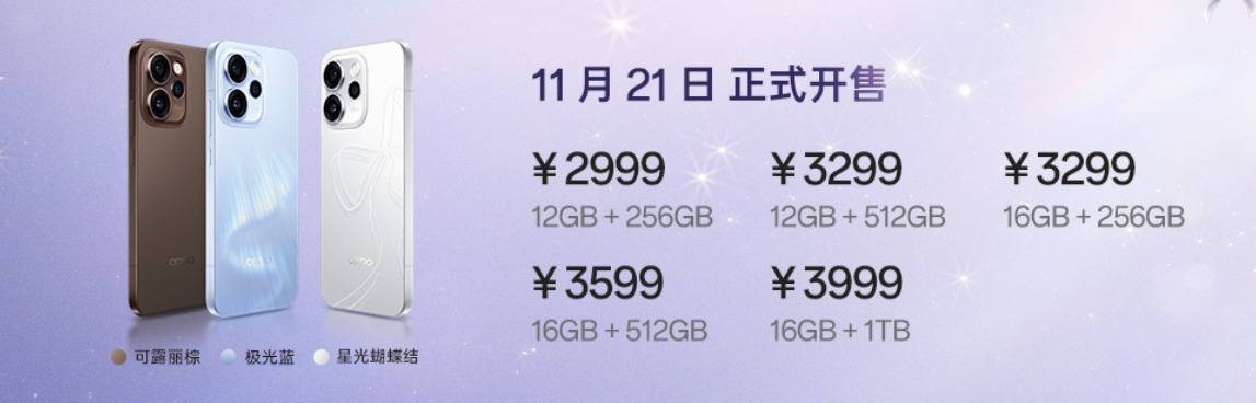 Reno15提供星光蝴蝶结、极光蓝、可露丽棕三种配色,12GB+256GB售价2999元起。