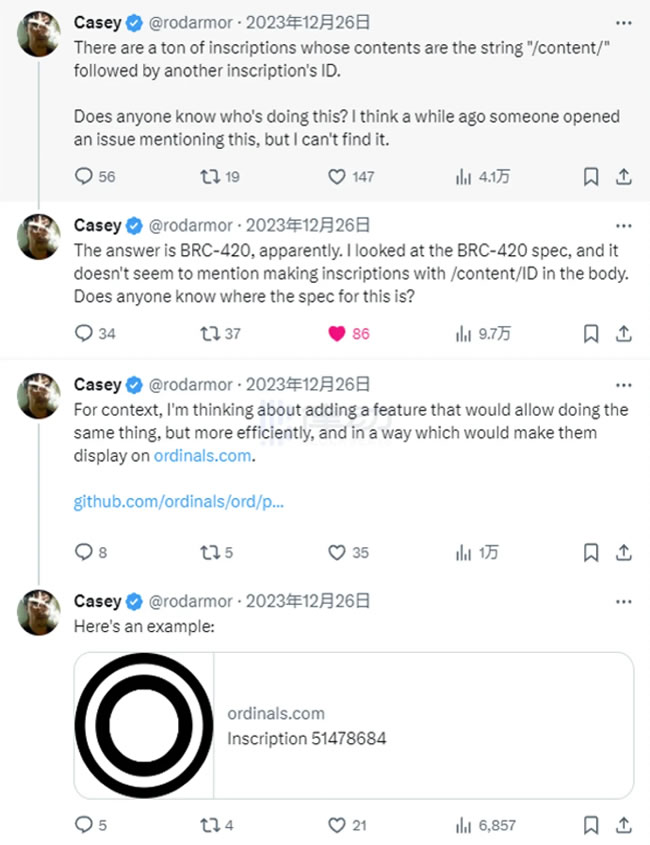 去年12月26日,Casey发现许多铭文都以“/content/”开头,随后是另一铭文的ID。他对此提出疑问,寻找谁在进行此类操作,并回忆起之前有人提及过这个问题。尽管一开始Casey在BRC-420规范中找不到有关这类“/content/ID”铭文的信息,但在经过社区成员和KOL比特里里的提示后,他找到了相关信息。这一发现激发了Casey的灵感,他随后创新了delegate字段,并将其纳入了Ordinals的最新升级中,该升级已经生效并在DERP的空投中得到应用。