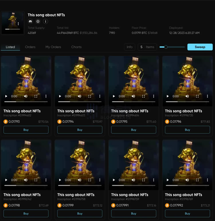这首关于NFT的歌曲由Elon Musk在社交媒体上发布,在当时引起了广泛的讨论和兴趣。2023年12月27日,Elon Musk在Twitter上发布了这段音乐视频,并声称“ETH上的NFT不是链上的”。之后社区将该视频上链,总供应量为42069。BRC-420用到了meme的力量。