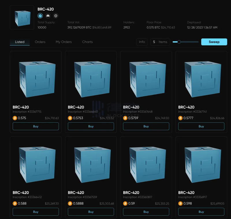 去年9月份,BRC-420里市值最高的“蓝盒子”,铸造成本还低到1刀左右,但现在,它的地板价已经涨到了近2.5万刀!这涨幅听着就让人激动。如果把它和比特币生态的龙头ORDI对比一下,就能更明显地看出它涨得有多疯狂。当时打一张ORDI(包含1000个币)的成本大概是2到3美元,现在按一个ORDI 60美元的价格算,一张的价格是6万美元,这可是超过两万倍的投资回报!当然,ORDI用了将近10个月才涨到这个程度,而蓝盒子只用了4-5个月。