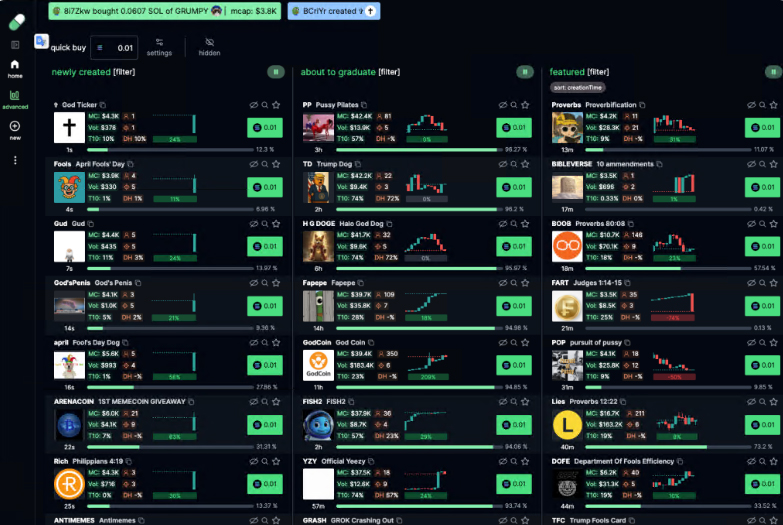 Pump.fun是一个运行在Solana和Blast网络上的迷因币发行平台,用户可以快速创建并交易个性化代币。