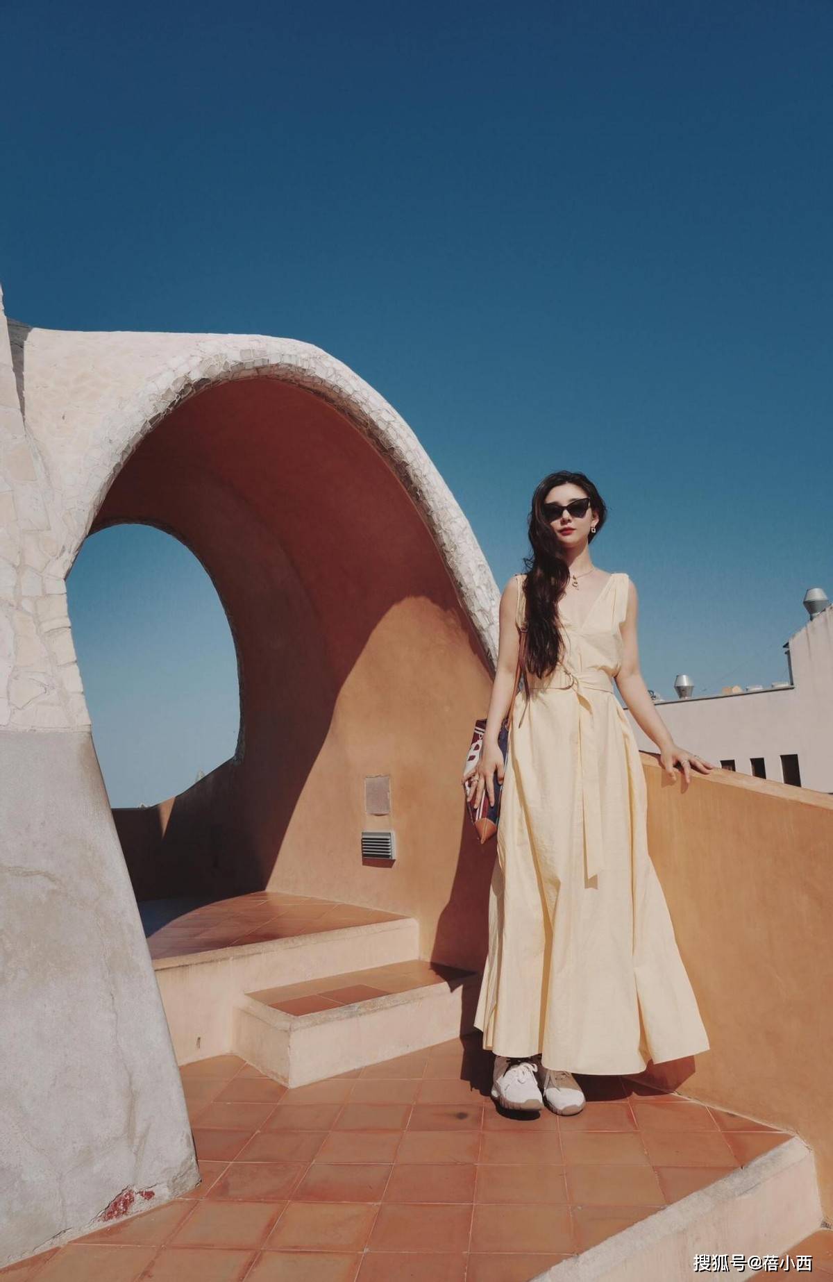 再看这一身白色连衣裙的搭配,采用棉麻面料,自带肌理感,比光滑面料更能“藏肉”,宽松的直筒剪裁顺着身形自然垂落,既不会紧绷勒出痕迹,又保留了身材的柔和曲线,连衣裙的无袖设计也很妙,露出 她的肩臂,带着恰到好处的性感。
