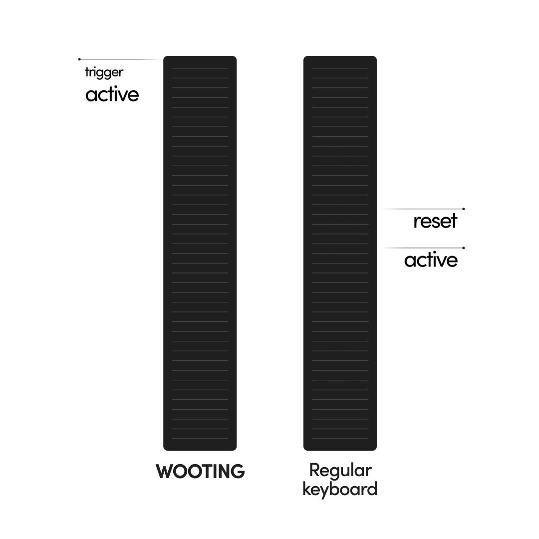 而基于磁轴的模拟特性,Wooting 60 HE还解锁了改变游戏规则的RT功能。这个功能颠覆了传统的按键释放逻辑。在玩家的手指还没完全抬起(按键行程尚未完全复位)的过程中,RT 就能反复、迅速地触发响应。这意味着,你抬起手指的任何微小位移,都会立即被识别为“释放”;而按下的任何微小位移,都会立即被识别为“触发”。这种革命性的输入控制,大大提升了玩家在竞技游戏中的反应速度和连续操作能力。