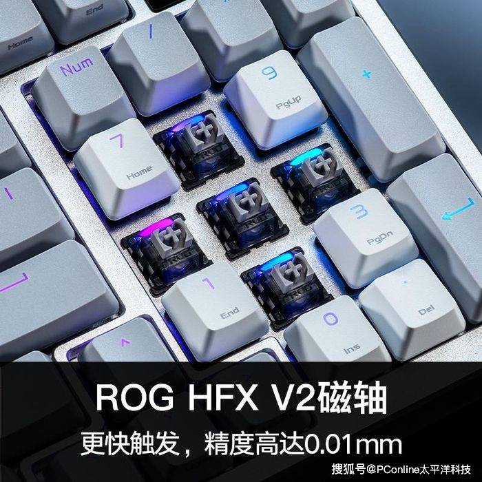 另外,夜魔98 HE还采用了全新ROG HFX V2磁轴,轴芯和底壳都是POM材质,上盖则为PC材质,按键寿命高达1亿次,手感扎实,触发反应快,整体稳定耐用。配合ROG霍尔传感器,能实现0.01mm精度的键程检测,磁通量容错表现更好,能效控制也更出色,非常适合FPS类游戏玩家。