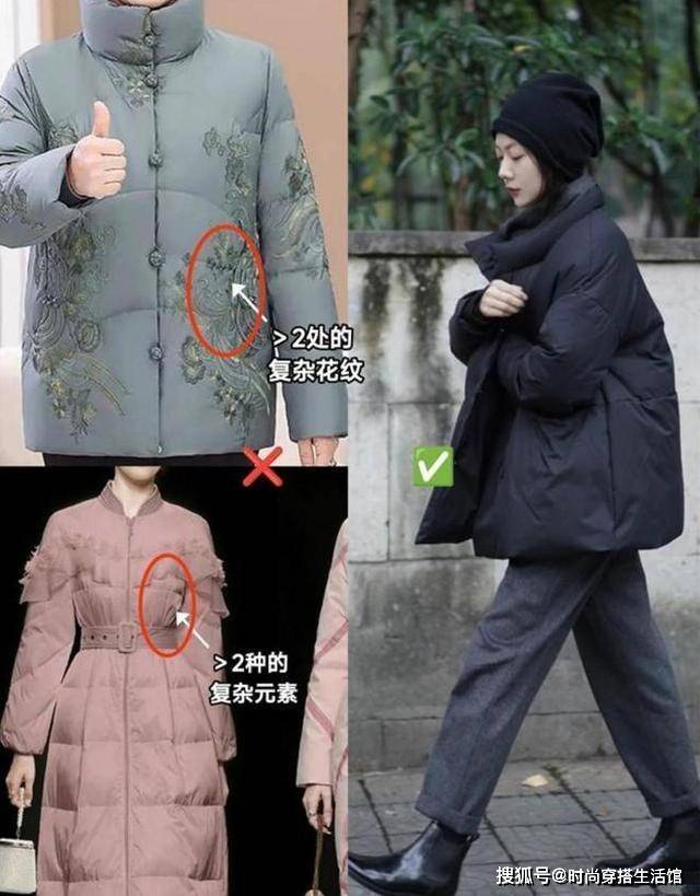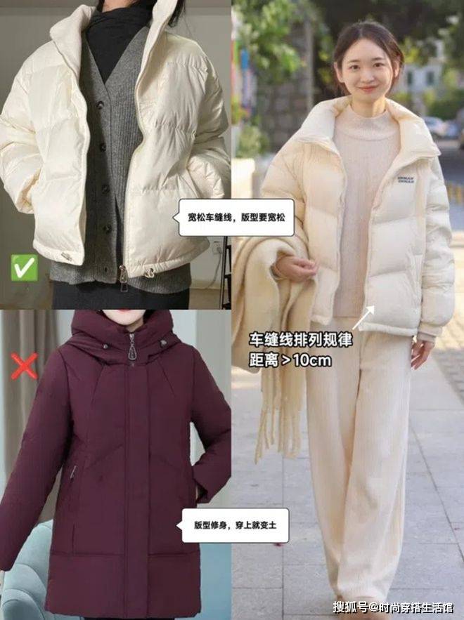 羽绒服本身款式比较厚实容易显得臃肿,而若是款式没有选择对,还会显得土气臃肿。尤其是一些小的细节设计上,比如说绗缝设计,绗缝设计本身是为了固定内胆,但如果太过密集,服装看上去就非常局促,而且还容易显得俗气。