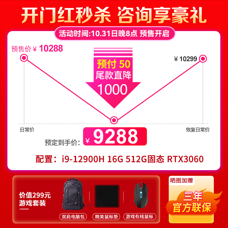 - i9-12900H,140W满功耗RTX3060,DDG2.5,2.5K165Hz电竞高刷屏。